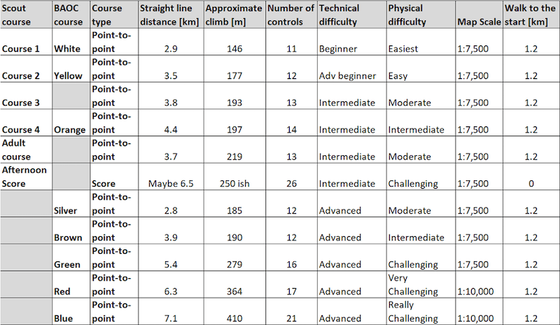 The Scouts have pre-assigned start times — please be on time. For the BAOC courses, the earliest start is at 10:00; the latest start at 12:30.
