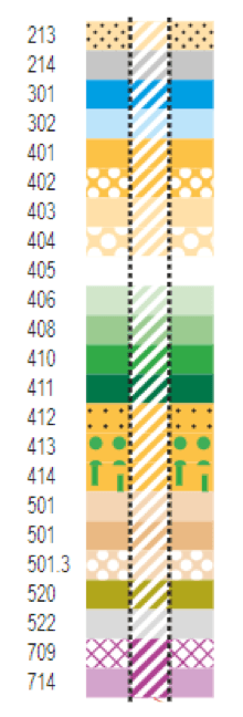 The middle column indicates how an upper level (i.e., that you can go under) is represented on the map: diagonal lines with the color indicating the characteristic of that level. For example, if the second level is itself covered, you would see an area mapped with the middle column of 522. If the second level is paved and open to the sky, it would be 501. If the second level is out of bounds, it would be 709. Here's an example (not from the St. Mary's map) showing several of these in action:
