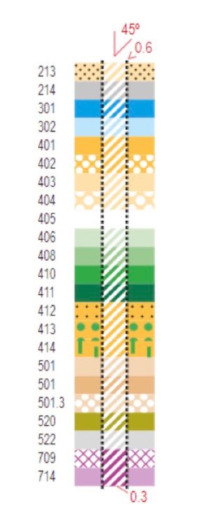 The middle column indicates how an upper level (i.e., where you can go under) is represented on the map: diagonal lines with the color indicating the characteristic of that level. For example, if the second level is covered, you would see an area mapped with the middle column of 522. If the second level is paved and open to the sky, it would be 501. If the second level is out of bounds, it would be 709. Here’s an example showing several of these in action: