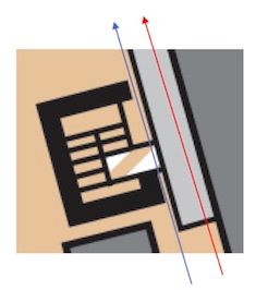 The small diagonal, white and beige area (i.e., 501) indicates that there is a second level. That level ends on the upper part of the building on the right side. It is possible to run under that upper part of the building as indicated with the red arrow, but you cannot be on top of this, so there is no diagonal stripping. In principle, this light grey area should be mapped as part of the building, with dashed lines underneath to indicate that it is possible to run under. Also, it is possible to run under the second level between the impassable wall (very think black lines) and the grey area (blue arrow). In principle this has to be indicated with triangles on both sides. Adding these symbols makes the map cluttered, and it was decided to map the area as indicated in the figure. There are not many situations like these.