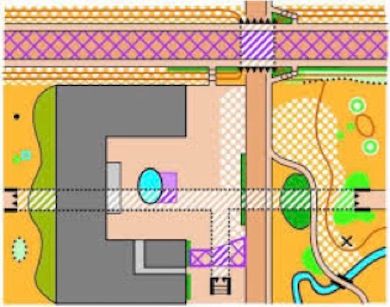 Where the lines are beige, you would be standing on pavement. Where they are light green, you would be in light-green vegetation. Note the area with diagonal olive-green lines is out of bounds on top. On the North side of the map, you will notice purple diagonal lines — this also means that the area is out of bounds on top. Finally, there are dotted lines through the building, indicating that the tunnel goes under the building (but since you cannot be in a building, that area has no diagonal lines for the level above the tunnel).